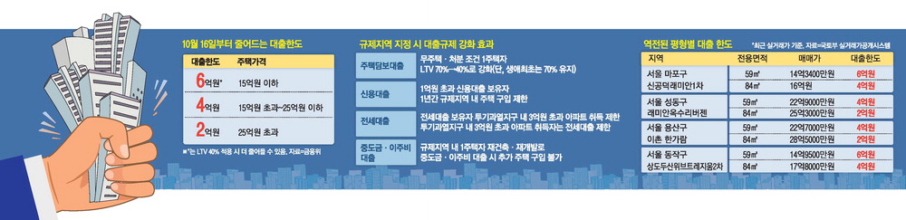 구체적으로 16일부터 수도권과 규제지역에 속한 25억원 초과 주택은 주담대를 2억원만 받을 수 있다. 25억원 초과 아파트가 몰린 강남권 일대가 타격을 입을 전망이다. 15억원 초과~25억원 이하 주택을 사려는 사람도 주담대를 4억원까지만 허용한다. 마포·성동·광진구를 비롯한 강남권 주변 한강벨트 아파트를 매수하려던 실수요자들의 자금 조달 계획에 차질이 빚어지게 됐다. 15억원 이하 주택은 기존과 마찬가지로 최대 6억원까지 대출이 가능하다. 시장 원리에 반하는 정책이란 비판이 나온다. 고준석 연세대 상남경영원 주임교수는 "선호도가 높아 담보가치가 뛰어난 부동산의 대출이 오히려 줄어드는 셈"이라고 밝혔다. 같은 아파트 단지인데 주택 평형에 따라 대출이 제각각인 기현상도 나타날 것으로 보인다.