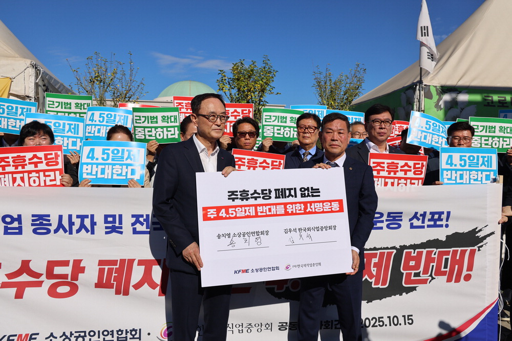 소상공인 업계가 '주휴수당 폐지 없는 주 4.5일제 도입'을 반대하는 100만 서명운동에 나선다. 15일 소상공인연합회는 서울 국회 정문 앞에서 한국외식업중앙회와 공동 기자회견을 열었다. 송치영 소공연 회장은 "주휴수당과 5인 미만 사업장 근로기준법 확대 적용이라는 이중 부담을 안은 채 주 4.5일제를 도입한다면 시급으로 인건비가 계산되는 소상공인·자영업 생태계는 붕괴할 수밖에 없다"고 주장했다. 소상공인 업계는 △주휴수당 제도 폐지 △근기법 확대 방침 철회 △고용노동부의 주 4.5일제 논의 과정에 소상공인 대표 참여 보장을 정부와 국회에 요구했다. 소상공인연합회