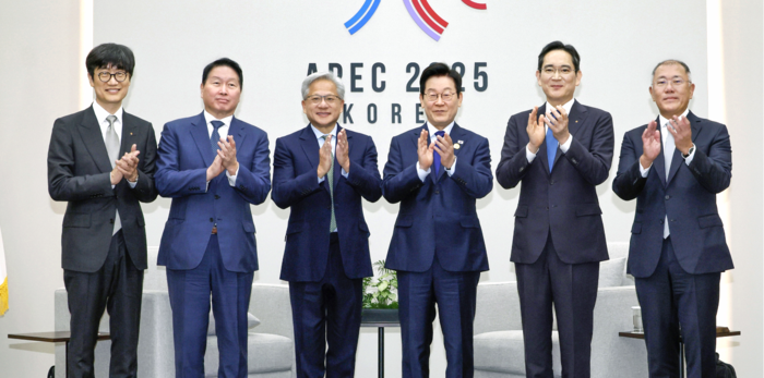 최태원 대한상공회의소 회장 겸 SK그룹 회장이 31일 APEC 정상회의장인 경주화백컨벤션센터에서 진행된 이재명 대통령과 젠슨 황 엔비디아 최고경영자의 면담에 참석해 발언하고 있다. [연합뉴스] 최 회장은 이와 관련 “SK그룹은 엔비디아와 AI를 국내 산업 전반의 혁신을 이끄는 엔진으로 만들고 있다. 이를 통해 산업 전반이 규모,속도,정밀도의 한계를 넘어서게 될 것”이라며 “엔비디아 AI 팩토리를 기반으로 SK그룹은 차세대 메모리,로보틱스,디지털 트윈,지능형 AI 에이전트를 구동할 인프라를 구축할 계획”이라고 말했다.