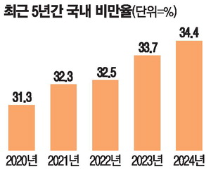 이에 따르면 우리나라 성인 비만율은 최근 10년 새 꾸준히 증가했다. 2015년 26.3%였던 비만율은 지난해 34.4%로 증가했다.