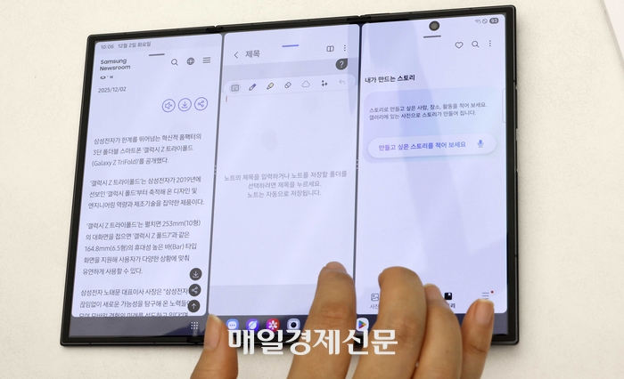 트라이폴드는 2019년 ‘갤럭시 폴드’ 이후 축적한 폴더블 설계·엔지니어링 역량을 집약한 제품으로,펼치면 253㎜(10인치) 대화면이,접으면 폴드7과 동일한 164.8㎜(6.5인치) 바 타입 화면이 구현된다.