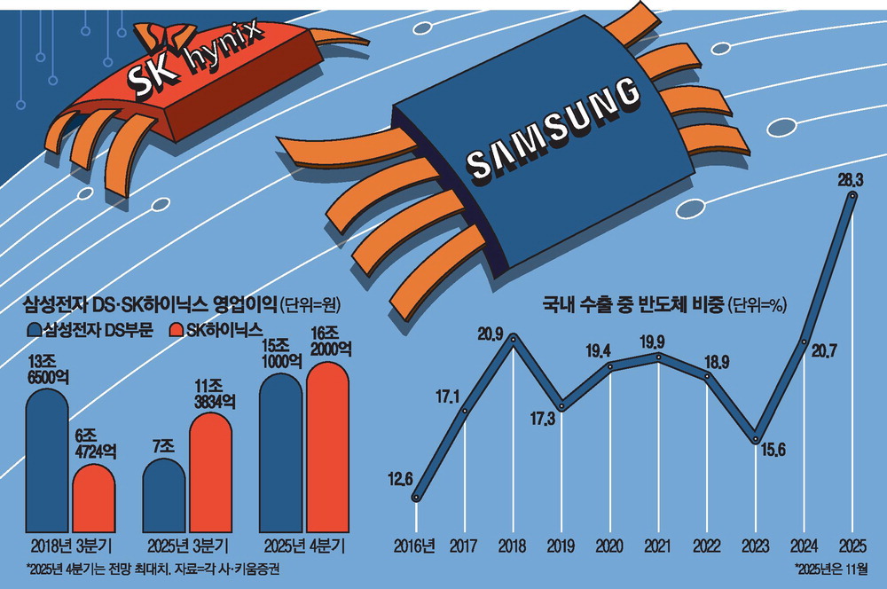 인공지능(AI) 기술이 세계적인 반도체 호황을 이끌면서 삼성전자와 SK하이닉스가 올해 4분기에 사상 최대 규모 실적을 낼 전망이다. 삼성전자가 시장 전망치보다 3조원가량 높은 영업이익을 거둘 것이라는 분석이 우세한 가운데 SK하이닉스도 16조원대 영업이익을 내며 양사가 30조원이 넘는 영업이익을 거둘 것이라는 설명이다.