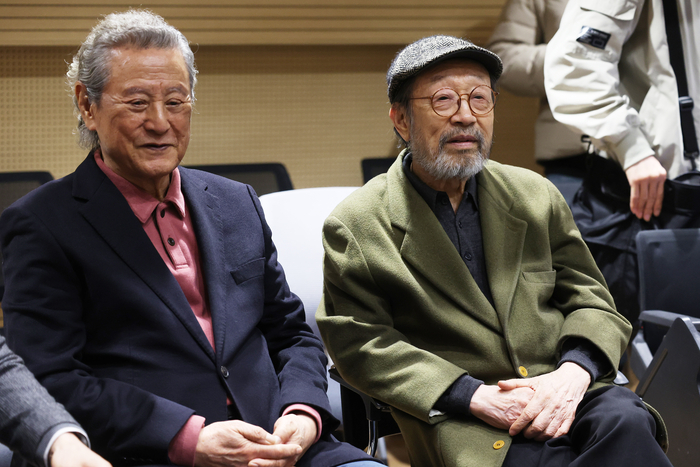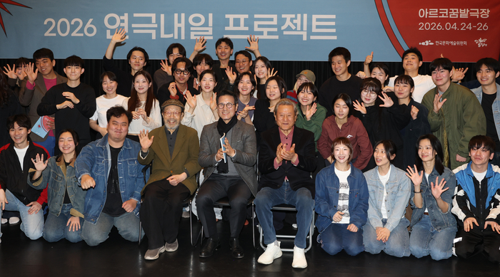 배우 박근형(왼쪽),신구가 7일 서울 종로구 대학로예술극장에서 열린 2026 연극내일 프로젝트 연습 현장 공개에 참석하고 있다. 연합뉴스 이날 연습 현장 공개에서 청년 배우들은 각 작품의 주요 장면을 시연했다. 강훈구 연출의 ‘탠덤’은 젊은 배우들의 열정이 앞서는 진지한 분위기 속에서 펼쳐졌다. 극 중간중간 신구와 박근형을 직접 언급하거나 신구의 유명 광고 대사를 패러디한 “니들이 기름 맛을 알아?”라는 대사가 등장해 웃음을 자아내기도 했다. 이민구 연출의 ‘여왕의 탄생’에서는 뮤지컬을 연상케 하는 군무가 이어지는 가운데 인물 간 권력 구조가 선명하게 드러나는 배우들의 연기가 돋보였다.