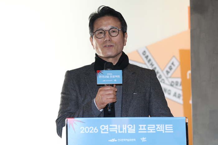 정병국 한국문화예술위원회 위원장이 7일 서울 종로구 대학로예술극장에서 열린 2026 연극내일 프로젝트 기자간담회에서 인사말을 하고 있다. 연합뉴스 정병국 위원장은 “연극내일기금은 이것으로 끝내지 않고 매년 이런 자리를 마련하겠다”고 약속하며 “두 선생님의 뜻이 60년 뒤에도 이어져,이 과정을 통해 무대에 섰던 사람이 또 이런 자리를 만들 수 있도록 뒷받침하겠다”고 밝혔다.