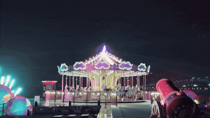 시그니처쇼/사진=김지은 여행+ 기자 먼저 회전목마 일대에서 ‘시그니처쇼’가 펼쳐졌다. 주말 오후 8시와 9시 두 타임에 걸쳐 6분씩 진행한다. 서울시 캐릭터 해치와 ‘용감한 시민들’이 함께 대포에 불을 붙이며 쇼가 시작됐다. 회전목마를 배경으로 불꽃과 레이저 등 화려한 효과가 터져나왔다.